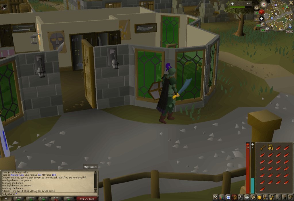 I ended up spending a lot of time here. I switched my attack style to controlled so that I would gain experience for attack, stregth, and defense all at the same time. The goal was to get everything up to level 40 so I could wield a Rune weapon.