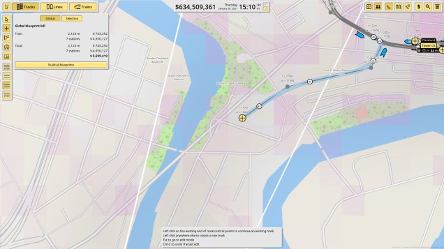 The game is in early access right now but is very playable and has gotten a lot of updates in the 2 weeks it’s been available. Right now, there are two ways to play: with money and with unlimited money. If you want to play a tycoon-like management game playing with money is the way to go. You start out with a loan of 1 billion dollars and can start building anywhere in the world. The goal is to pay off your loan and turn a profit to expand your rail networks. Unlimited money offers more of a creative mode but includes all of the management options as playing with money. It even gives you the accounting stats. Unlimited money seems geared more towards people who want to create real-life rail systems as opposed to imagined ones.
