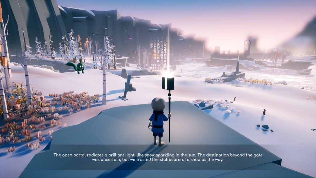 The story tells of a tribe on a pilgrimage to a door of light that will lead them to a better world. It’s unclear if these messages were left behind for the player character to find or if they’re the player character’s own thoughts as they progress through their pilgrimage. They’re written in a sort of flowery, prose that I’m not too keen on.