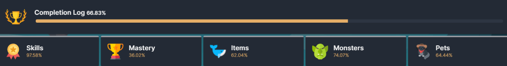 | Skills 97.58% (+2.85%) | Mastery 36.02% (+1.42%) | Items 60.04% (+7.28%) | Monsters 74.07% (+12.96%) | Pets 64.44% (+2.22%) |