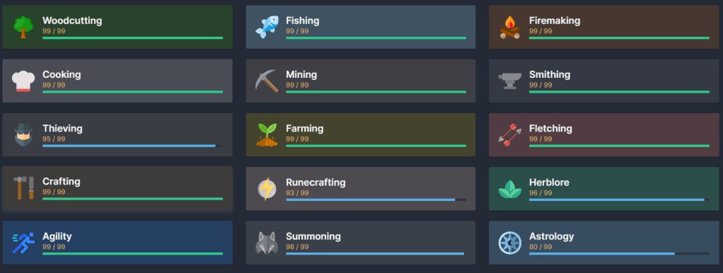 | Agility 99/99 (+0) | Summoning 98/99 (+1) | Astrology 80/99 (+1) |
