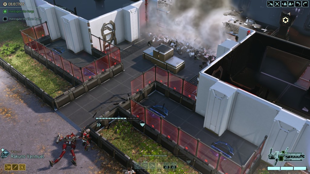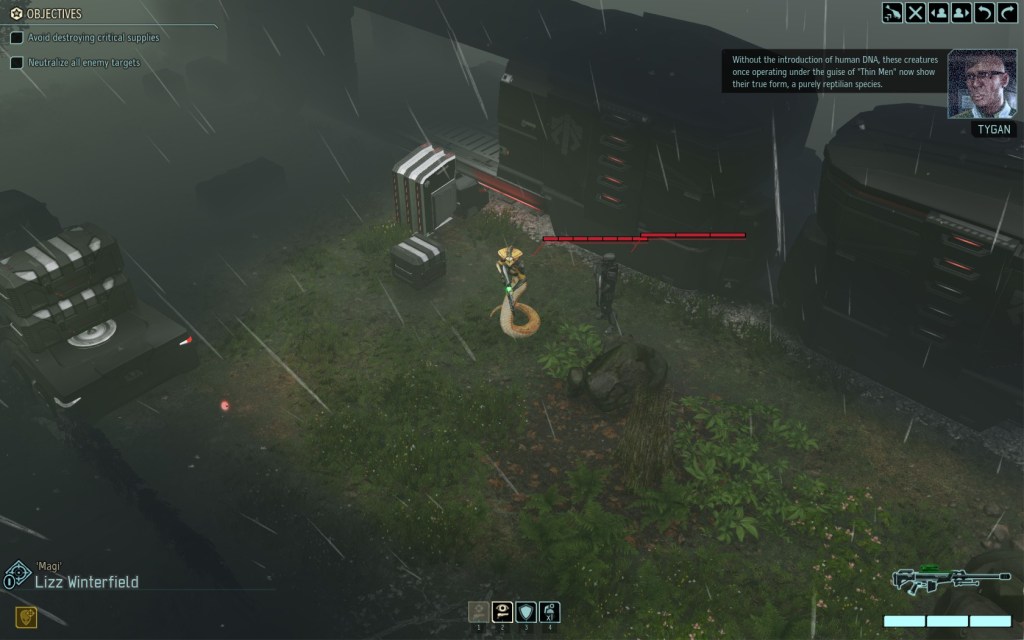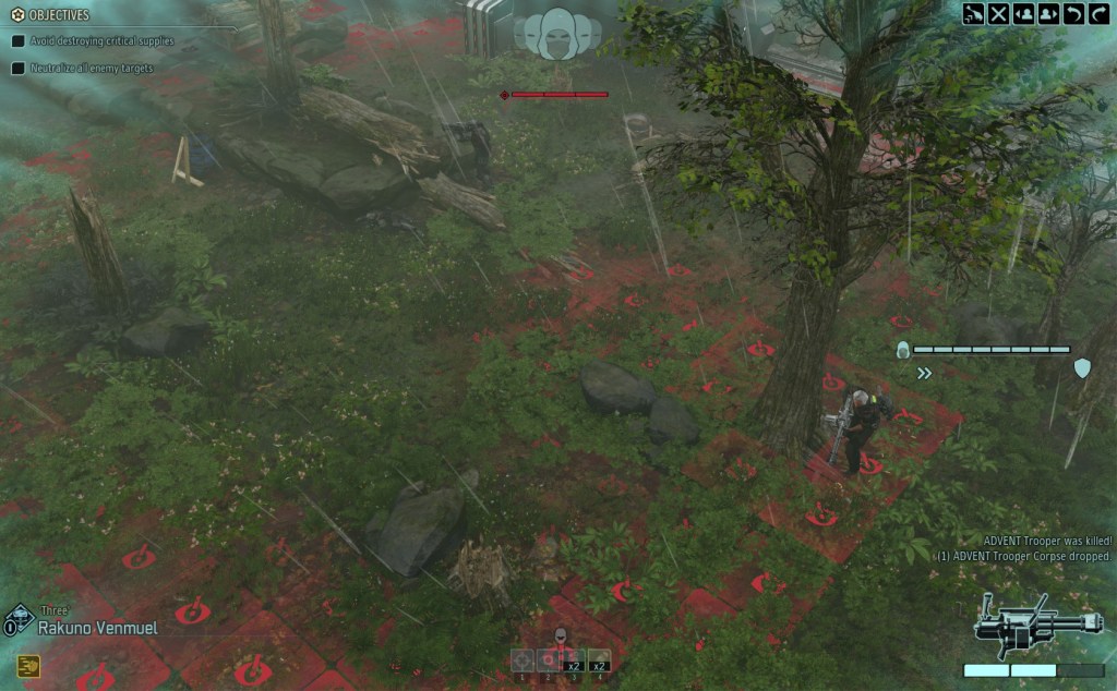 On the enemy’s turn, the Gatekeeper floated right up to Silentdeath, fired point blank, and took her down to half health. Thanks to the Hellweave I equipped it took some damage back and was set on fire. Silentdeath retaliated with the machete. Not quite effective against a big armored ball…but it got some damage in. In preparation for another blast from the Gatekeeper, Bookahnerk sent the drone over to Silentdeath Aid Protocol style to add some extra defense. Rakuno laid down some suppression fire to inflict an aim penalty. Turns out, it wasn’t really necessary because the Mailman himself delivered a critical hit and took down that Gatekeeper no problem.