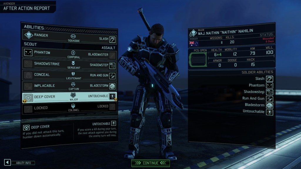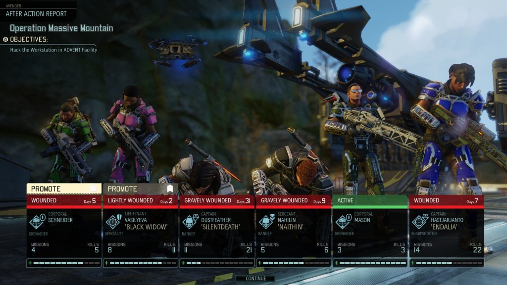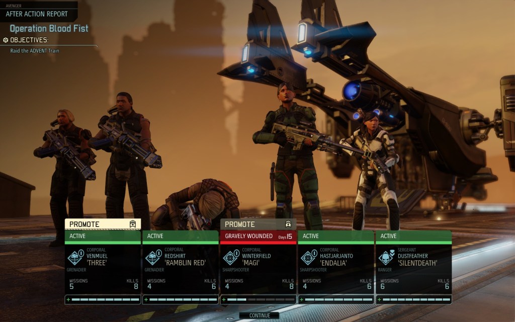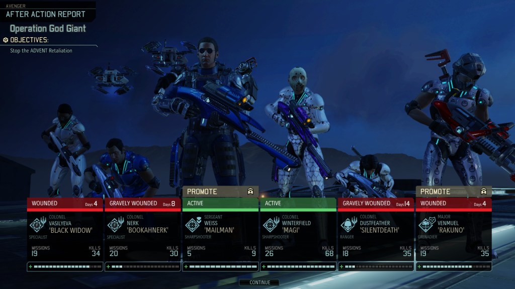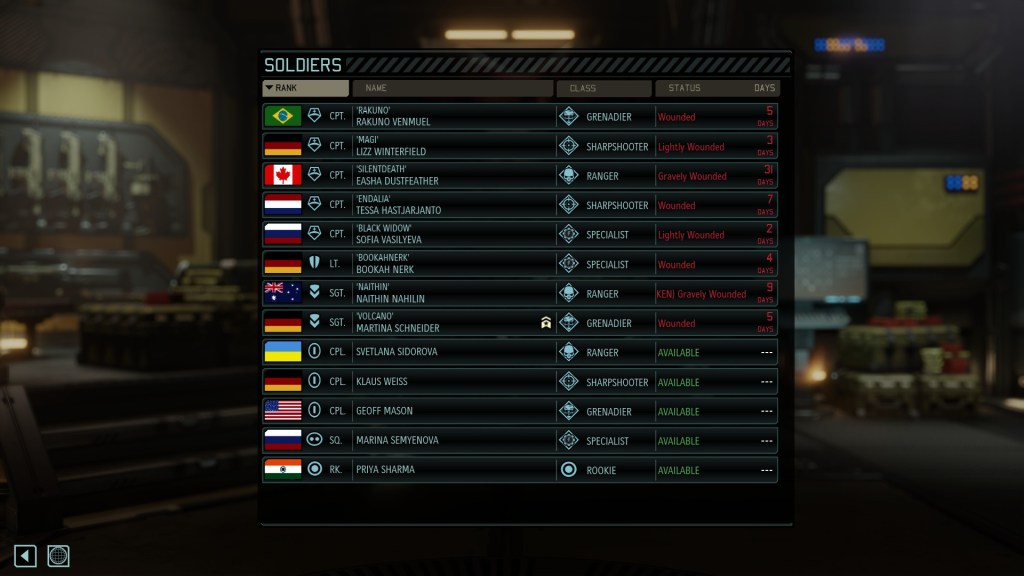 The only ones who made it out of this mission uninjured were our two snipers: Mailman and Magi. Everyone else was in various states of injury. Silentdeath was the worst at 14 days recovery time followed by Bookahnerk at 8. We probably won’t be seeing them for a while.