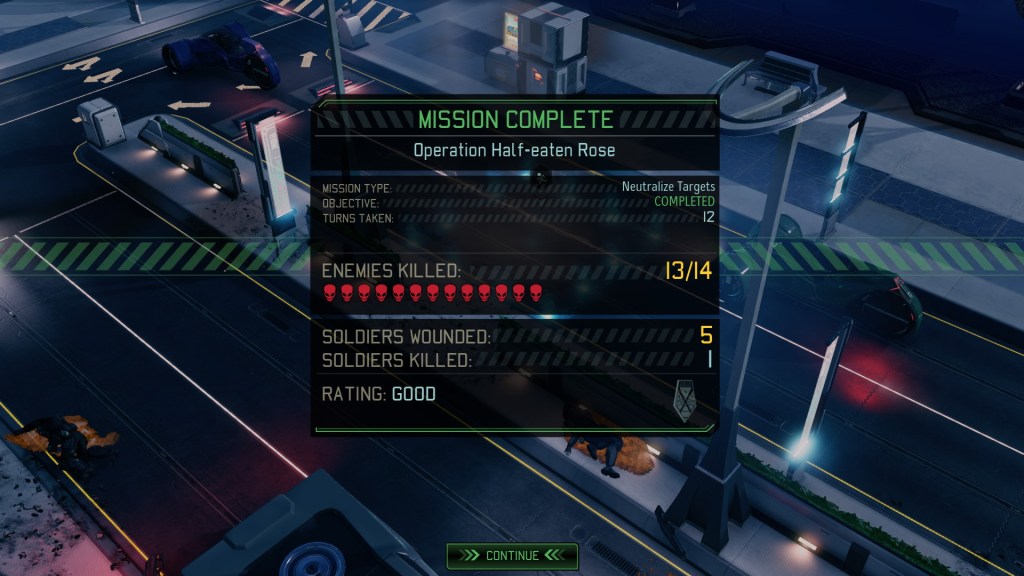 Bookahnerk took down the solider on the next turn but the mission wasn’t over just yet. Another civilian turned in to a Faceless. The squad obliterated it completing the mission just in time. Silentdeath only had two turns left before bleeding out.