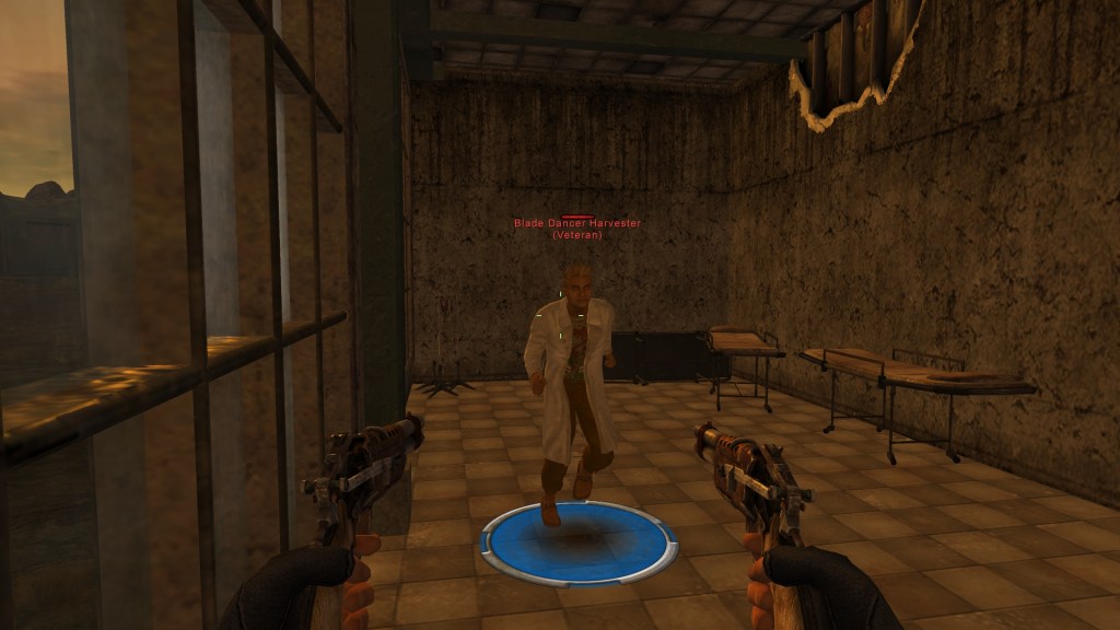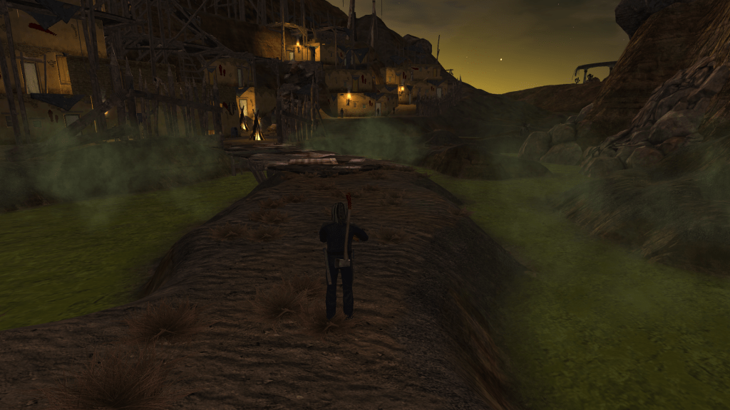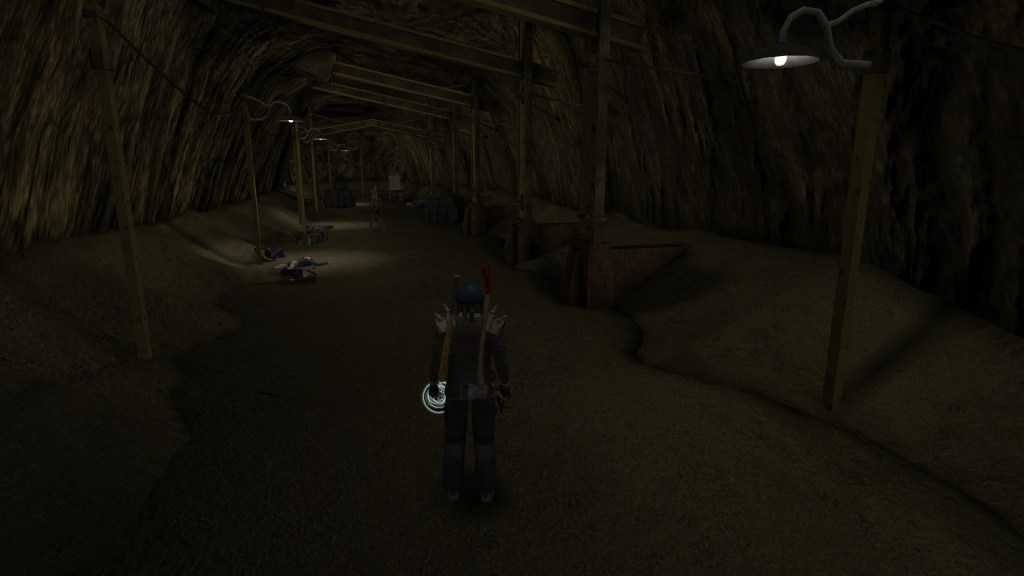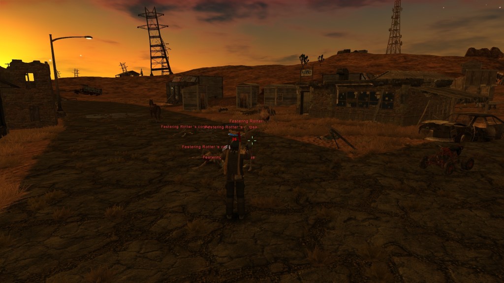 The next quest for “You’re Dying” took me up to Rest Stop which is right above Old Kingman. As it turns out, the town of Rest Stop is overrun by creatures called Festering Rotters. I was able to wade through the festering hordes and find only two people left in the whole place: a woman worried her husband hasn’t come back from rounding up sheep and another clone of Lifenet Technicahian Grahm. Grahm tells me that there’ a malfunctioning Lifenet facility in the mine just out of Rest Stop that’s spitting out bad worker clones. Once the clones degrade they become the festering rotters. Which explains why there were so, so, so, many all over the place. There’s also a sample of Alpha Clone DNA down there that will help fix my own DNA.