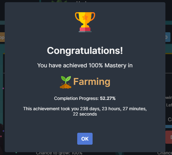 I got a whole lot of 99s this week. Attack, Strength, Magic, and Hitpoints are all now max level thanks to running so many Slayer Tasks this week. I’m hoping these stats are good enough to take on In to the Mist. Can I Idle Melvor? doesn’t have a listing for the last two dungeons so I’ll have to find out if I have enough health/damage reduction once I get in there.