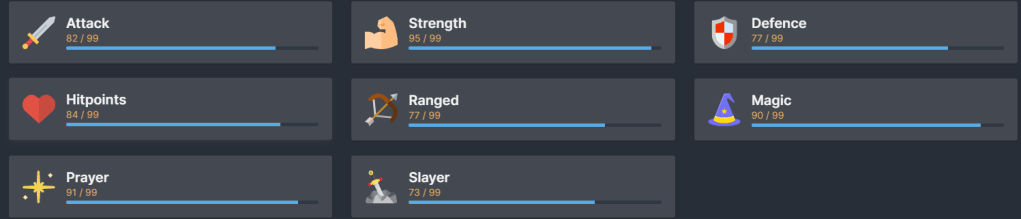I got Crafting to 99 this week. It doesn’t provide any benefits other than a Steam achievement because there’s nothing to craft after level 90. I got bored of Slayer tasks in the middle of the week and used all of the dragon hides I had collected so far to see if I could max the skill. I didn’t unlock the pet before getting to max level so I’ll have to revisit crafting at some point for that.