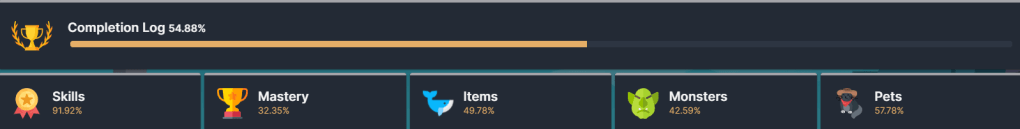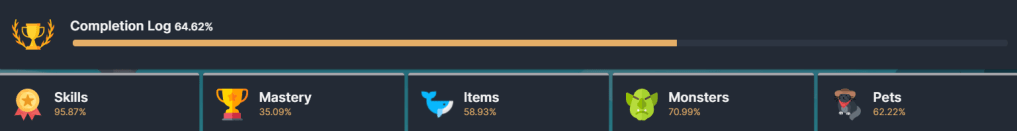 | Skills 97.58% (+2.85%) | Mastery 36.02% (+1.42%) | Items 60.04% (+7.28%) | Monsters 74.07% (+12.96%) | Pets 64.44% (+2.22%) |