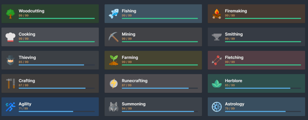 | Thieving 95/99 (+0) | Farming 114/99 (+0) | Fletching 103/99 (+1) |