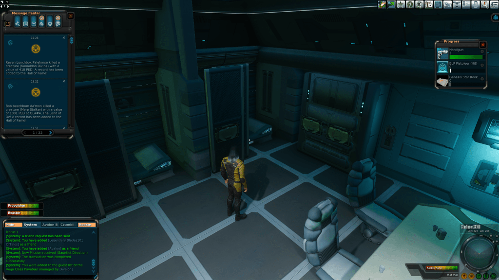 From my understanding, players own ships that can travel real fast between planets and they sell this service to other players. Space can be traversed by smaller and slower craft but since we were streaming we didn’t have time to wait for an hour an a half one way for Greg to come pick me up. Before I knew it I was getting a private message from a pilot who would come pick me up in 5 minutes. Fresh out of the tutorial, I had no idea what to expect but I kept getting messages about how it would all work. I would be summoned to the ship, we would be making a stop at another planter, Toulan, and then I would be brought to Arkadia Space station for Greg to pick me up. Space is also a PVP zone so it was recommended to log out if I had tradable items on me during travel. 10 minutes later, I was in Arkadia Space station and it only cost Greg the price of a small cup of coffee.
